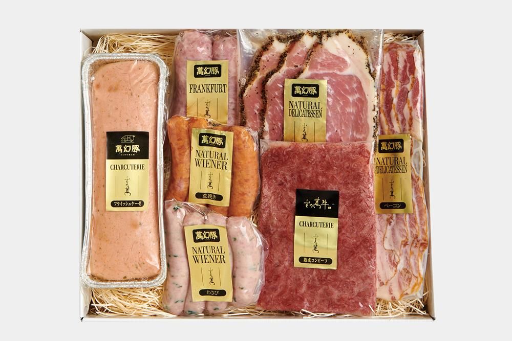 さの萬では、フランス語のシャルキュトリーという言葉を使って、商品をご紹介しております。店頭では、萬幻豚の白カビサラミ、レバーペースト、フライシュゲーゼ、パテ、ハム、ソーセージ、生ハム、コンビーフなど50種類のシャルキュトリーを、常時列べております。